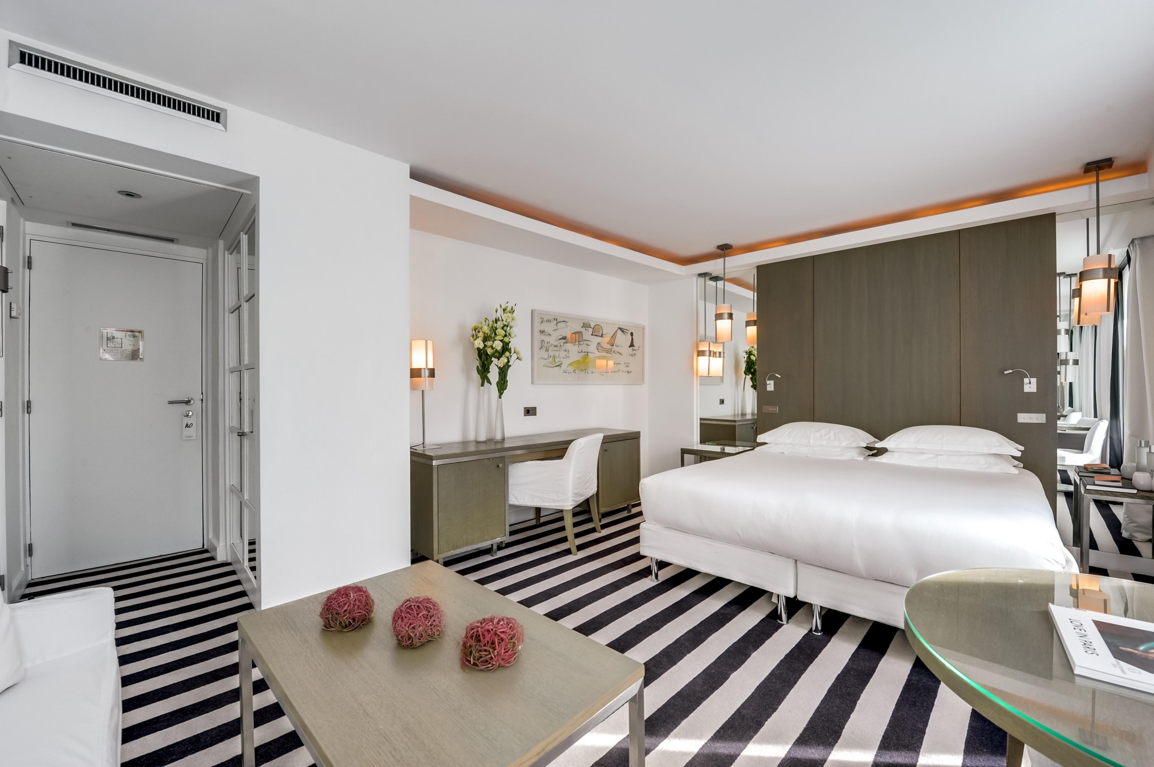 Hotel Le A's Junior Suite with Balcony offers a balcony facing the rue d'Artois furnished with a table and two chairs. The bathroom includes a bathtub.